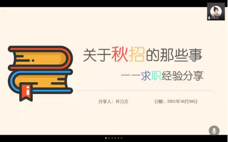 会议开始,涂艳老师总结概括了往届经验分享会的摸排反馈结果,并向大家介绍了本学期分享会的规划,本次活动周期将延展至2022年1月,分享会将扩增内容主题、扩展嘉宾范围,聚焦求职、电商业界发展、数字技术应用、研究生规划及考博准备,精准靶向大三至研二员工群体的科研知识储备、求职技巧需求等。第一期周末分享会以“关于秋招那些事——求职经验分享”为主题,立足在校生现实需求,引导在校生汲取朋辈之力,提升自身求职能力。