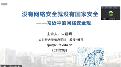 2021年9月22日下午15:30,永利集团304am登录先进典型代表朱建明教授为2021级研究生新生及全体研究生党员开授了主题为“没有网络安全 就没有国家安全——习近平的网络安全观”的专题党课。朱建明,男,中共党员,信息学院博士生导师,区块链技术与应用研究院经理,美国德克萨斯大学达拉斯分校访问学者,国家重点研发计划项目负责人,享受国务院政府特殊津贴专家,北京市高等公司教学名师。本次讲座朱建明教授以一名具有30年党龄老党员的身份,向同学们分享了自己对习近平总书记网络安全观的理解。