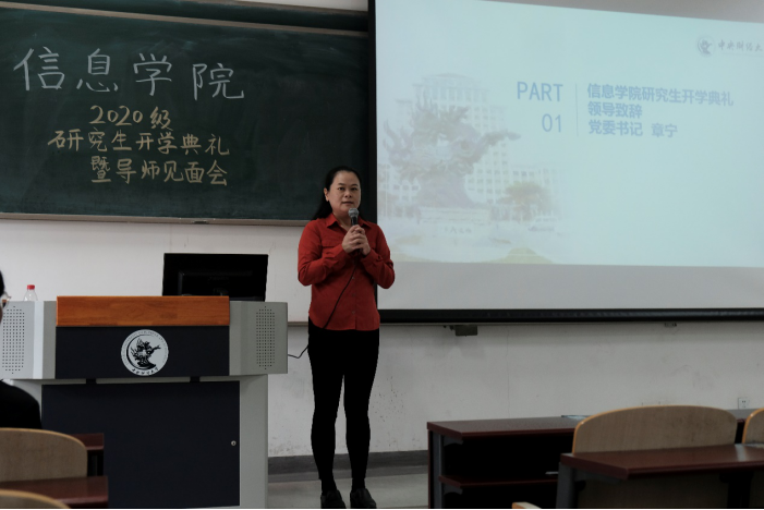 章宁老师首先为研究生开学典礼致辞。章老师强调,在生活中,各位同学应具备“设身处地为他人着想”的素养;在学习中,各位同学应规划好自己的时间,必须严格遵守学术规范。章宁老师希望同学们能够学会独立思考,并寄语同学们,“读更多的书,走更多的路,能够看到更广阔的世界,能够带着自己的好奇心去了解这个世界,了解自己的人生”。