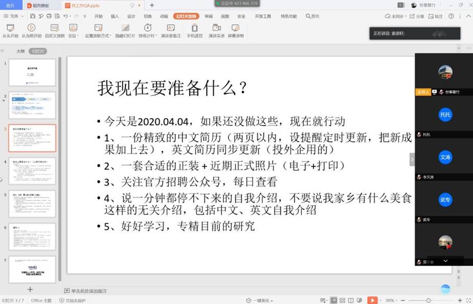 本次“翘首以盼,春暖花开”系列活动充分发扬了“传帮带”的优良传统,帮助2019级研究生实现学习、科研、求职协同共进,增强了大家合理平衡科研与求职的信心。同学们根据学长分享的经验,结合自身情况有条不紊地完成当前阶段的任务,班内逐步形成了科研问题共探讨和求职信息共分享的良好氛围,活动效果显著。