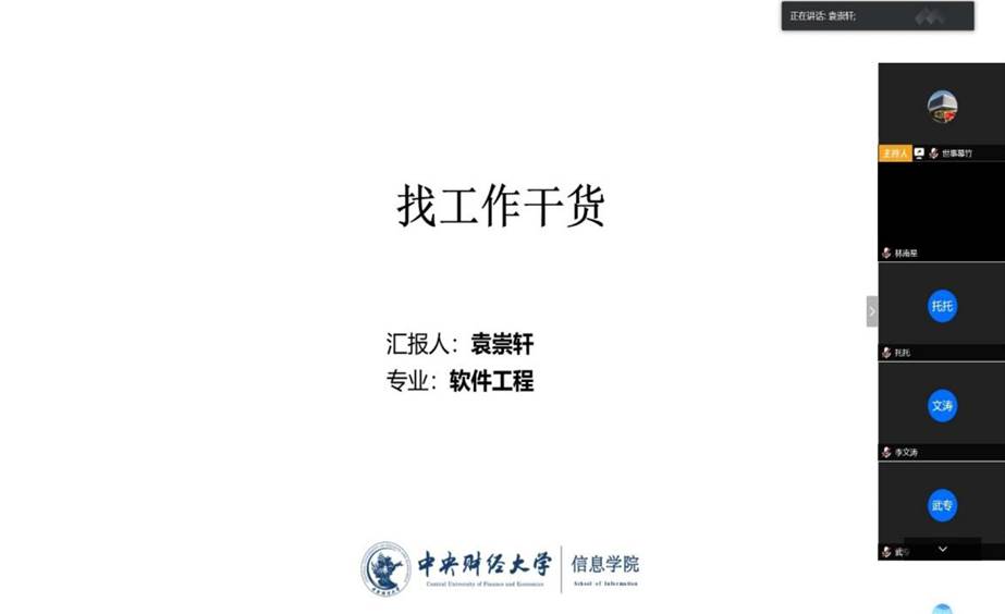 科研经验分享结束后,在多家政策性银行、券商实习并即将入职中国农业银行总行的永利集团304am登录2018级硕士生袁崇轩为同学们带来了求职经验分享。帮助同学们更好地规划研究生学习生涯,并为将来职业生涯发展尽早打下坚实的基础。袁崇轩同学的介绍包括求职关键时间点介绍、个人准备、求职流程、求职建议和解答疑惑五个方面。