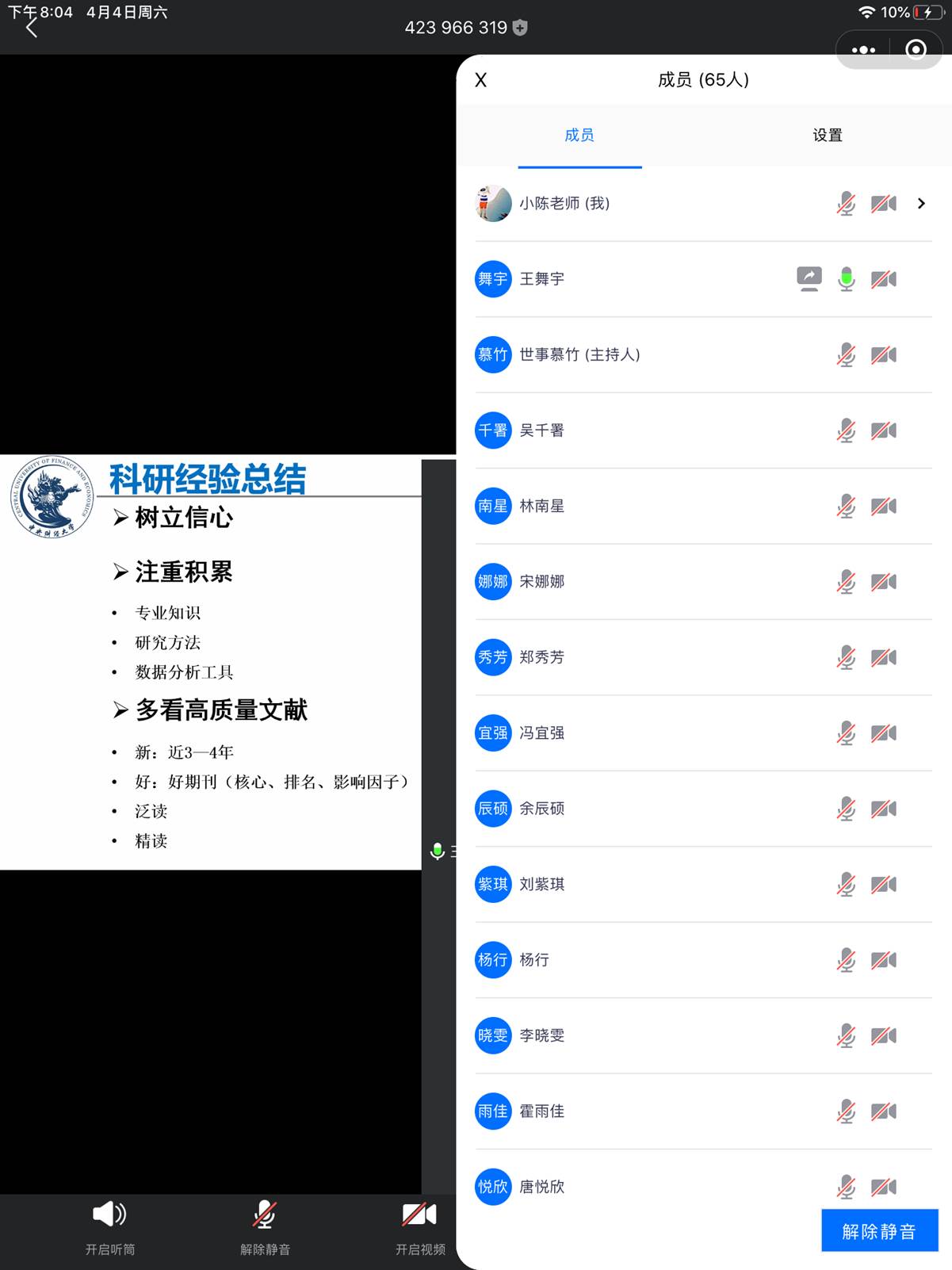 为督促2019级研究生在家更好地开展科研工作,有针对性地进行帮扶,公司研工办在班级内进行摸底,收集同学们近期在科研上遇到的问题,并于2020年4月4日晚8时,邀请了永利集团304am登录2019年博士研究生国家奖学金获得者、国家公派联合培养博士生王舞宇开展线上科研分享活动,永利集团304am登录研究生工作办公室主任陈玉婵老师、研究生辅导员陈文秀老师、永利集团304am登录全体2019级研究生和部分本科生参加活动。