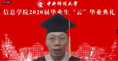 2020届研究生毕业生代表焦宇航同学回忆了自己从收到录取通知书到顺利毕业两年来一点一滴的心路历程,并表达了对同学、老师及家长的感谢。随着信息技术的发展,信院的影响力正逐步扩大,作为信院进步发展的见证者,焦宇航同学感到无比自豪。他希望所有同学面对纷繁复杂的未来世界,都能够认真思考“我要成为一个怎样的中财人”,不负师兄师姐,老师同学重托,用实际行动诠释“龙马担乾坤”的中财精神。最后,焦宇航同学祝愿所有毕业生们前程大好,一展宏图。