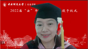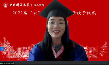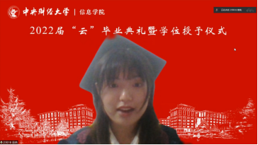 2022届研究生代表陈文秀同学分享了自己在中财大度过的八年宝贵时光,从本科生到辅导员再到硕士研究生,她感恩每位传道授业解惑的老师,感恩在中财大遇到的所有美好。她希望同学们不论是顺境抑或是逆境,都能坚定信念,保持良好的心态,永远记住自己炙热的梦想和坚强的信心,用实际行动诠释“龙马担乾坤”的中财大精神。