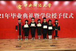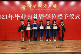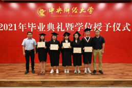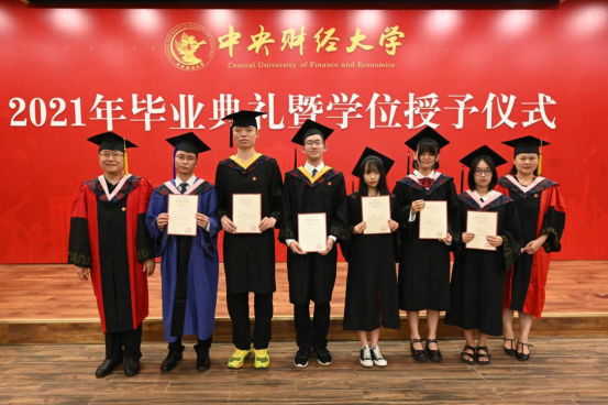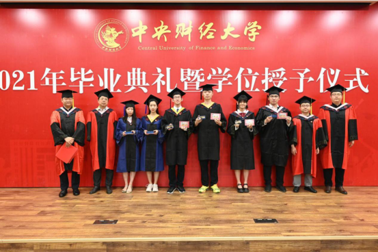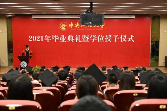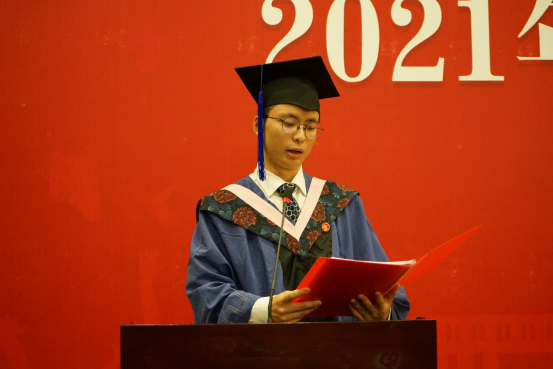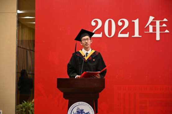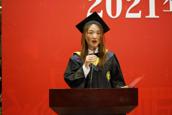 在毕业生代表发言环节,孙翼、吴千署、杨春蕾分别代表2021届本科生、研究生和2020届毕业生发表毕业感言。孙翼同学表达了对老师衷心的感谢与崇高的敬意,回顾曾经走过的点点滴滴,中财大精神代代传承,散发着动人的光辉。恰逢时代之光,信息技术与国家发展融合,日新月异,呼吁当代青年学子回顾党史,汲取经验,砥砺品格,发扬传统,始终牢记时代期许,不断创新,与理想相拥。吴千署同学以党史学习为契机,呼吁毕业生们要铆定“三颗心”:一为“千磨万击还坚劲”的初心,二为“羊有跪乳之恩”的感恩之心,三为“苟利国家生死以”的爱国心,响应号召,爱国爱民,不忘时代重担,永远阔步前行。杨春蕾同学感慨中财大是她人生永恒的印记,代表2020届毕业生对母校和老师们表达深深的感谢,感恩2020年老师们为毕业生上了一堂行走的毕业思政大课,不辞辛苦打包爱心行李。寄语毕业生们能坚持所爱,勇于追梦,热爱脚下的风景;能胆大心细,踏实专注,心怀目标,不断进取;能常怀感恩,肩负天下,有一条更加勇敢、从容的坦荡大路;能早日成为让党和国家放心的强国一代。