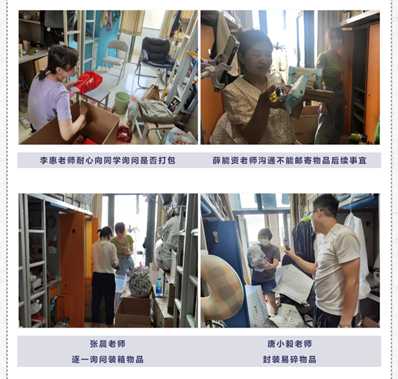 秉承用心服务、细致整理、分类放置、妥善邮寄的宗旨,确保毕业生所有行李安全到家,在行李打包前期,老师们通过各种方式确认核对邮寄行李人数、邮寄物品清单及详细邮寄地址。在整理行李过程中,为了避免遗漏,老师们全程与员工视频通话,一手举着手机,一手挑选物品,在员工的“导航”下,一件件物品精准“定位”,老师们通过点对点、一对一的服务,确保了每一位同学的物品准确齐全。
