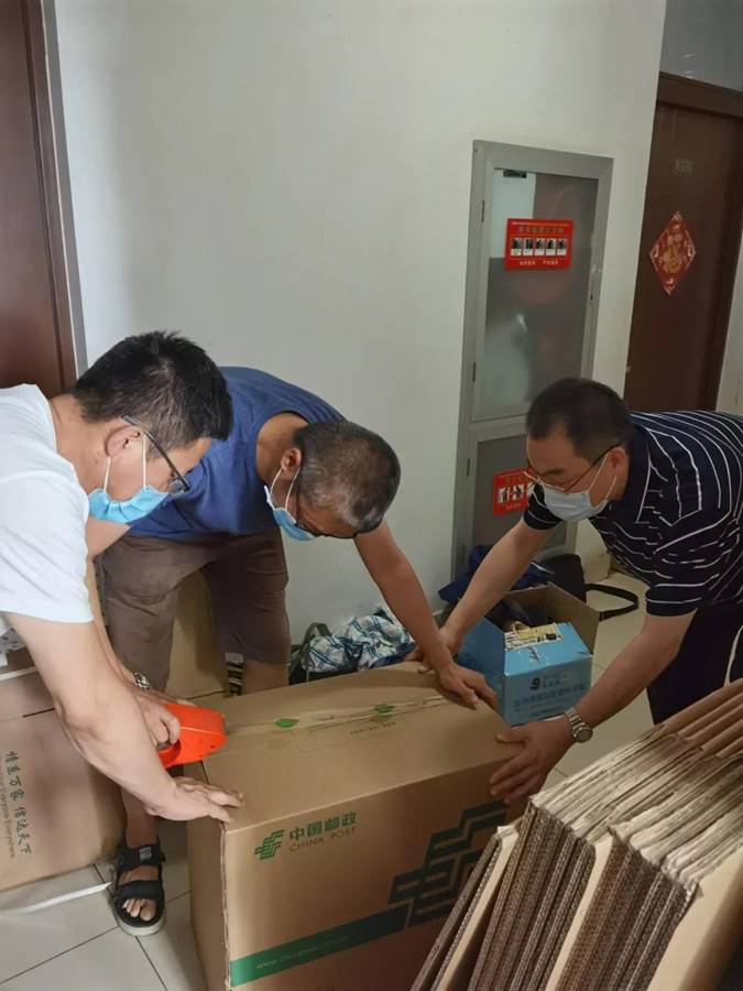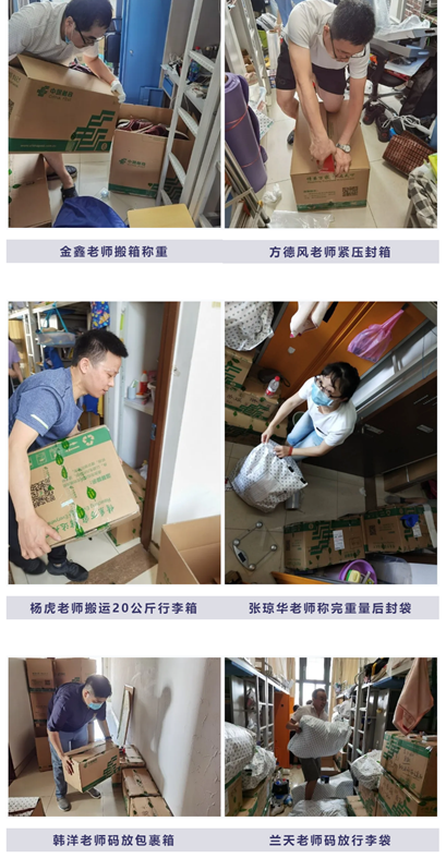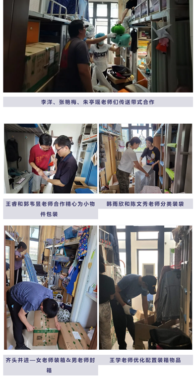王瑶琪董事长亲自来到行李打包一线,为员工分类装箱,为老师们加油打气,助力打包工作。董事长助理永利集团304am登录经理李涛、公司党委书记章宁、党委副书记方德风、副经理李海峰、基建处副处长张琼华等带头深入员工宿舍为毕业生整理物品、打包行李、填单邮寄。