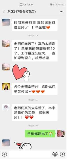 老师们放弃休息时间,扎进员工宿舍,高强度持续作战。老师们不辞辛劳,不计回报,只为毕业生们收到包裹时踏实的微笑,这包裹装满回忆,装满祝福。