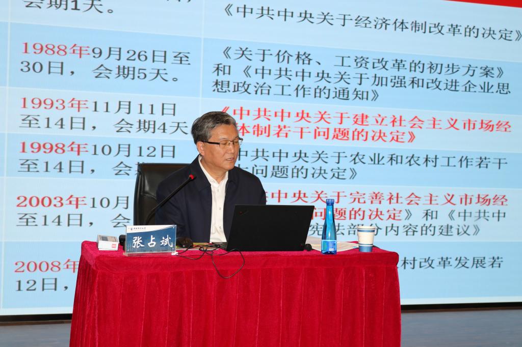 10月9日下午,公司党委联合统计与数学公司党委、国际经济与贸易公司党委举办学习贯彻党的二十届三中全会精神专家辅导报告会暨公司党委二级理论学习中心组(扩大)学习会。中央党校(国家行政公司)中国式现代化研究中心主任、国家哲学社会科学一级教授张占斌应邀来校作题为“进一步全面深化改革,为中国式现代化注入新动能”辅导报告。报告会由公司党委书记方德风主持。本次报告会是公司深入学习贯彻党的二十届三中全会精神,提升全院师生政治理论水平的重要举措。